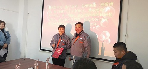 總經(jīng)理助理、辦公室主任王德華宣讀了頒獎詞,公司領(lǐng)導(dǎo)向獲得表彰的人員頒獎。徐總頒發(fā)了“先進個人、先進集體”獎;魏總頒發(fā)了“優(yōu)秀員工、技術(shù)創(chuàng)新之星”獎;胡總頒發(fā)了“技術(shù)能手、服務(wù)之星”獎;劉總頒發(fā)了“優(yōu)秀新人”頒獎。